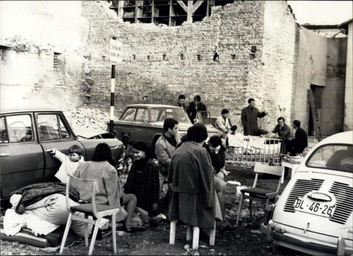 - Dok su stanovnici grada još spavali ili se pripremali za posao u fabrikama i preduzećima, dok su žene polazile na pijacu ostavljajući decu u postelji, zemljotres je u trenutku pretvorio Skoplje u ruševine smrti i užasa. Nekoliko minuta kasnije, kada su se razredili oblaci prašine, Skoplje je pružalo stravično bolnu sliku.