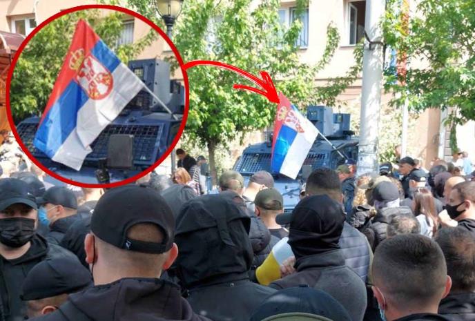 ZVEČAN - Okupljeni Srbi ispred opštinske zgrade u Zvečanu okačili srpsku su trobojku na jedno od oklopnih vozila kosovske policije, a na jednom su i iscrtana četiri ocila poput onih na grbu Srbije.