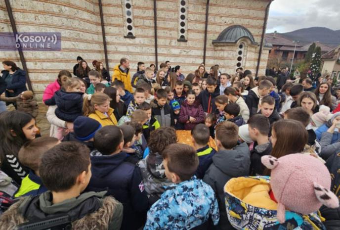 "Danas na ovaj veliki praznik nas je okupila crkva i Bogomladenac, a tradicija u našem gradu je da imamo domaćine kako bi smo što dostojnije pripremili ovaj praznik, na prvom mestu skupština opštine Leposavić koji je pokrovitelj paketića i ove radosti, a na drugom mestu je i porodica Dimitrijević iz Drena koji su umesili česnicu i pripremili kolač, time smo i sinoć dočekali Božić.