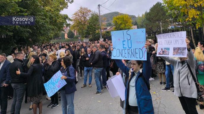 Okupljeni duvaju u pištaljke i nose transparente na kojima je prikazan Aljbin Kurti sa natpisom "Sudija, porota i izvršitelj", kao i "Samo nek ide po redu".