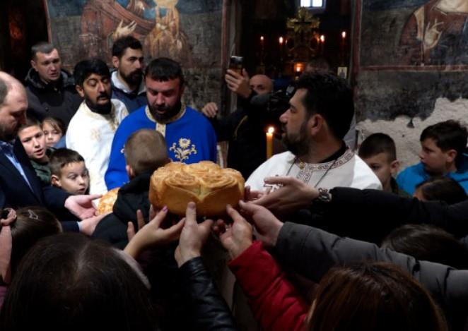 „Blagodarimo i današnjim svečarima koji su se potrudili da se okupimo ovde i proslavimo ime Božije. Blagodarimo starim i novim kolačarima. Pored Opštine koja proslavlja slavu Vavedenje Presvete Bogorodice na čelu sa svojim predsednikom Milanom, ovde imamo uvek jednog kolačara po crkvenoj slavi, prošle godine je kolač uzeo i pripremio Aleksandar Marković sa svojom porodicom, a za narednu godinu se prijavio naš freskopisac Đorđe Milanković koji nam je živopisao hram Svetih Flora i Lavra“, rekao je u besedi otac Dragiša Jerinić.