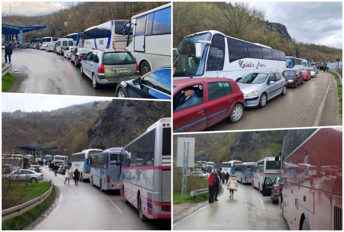 Na desetine autobusa sa Srbima sa severa Kosova čeka kako bi prešlo Jarinje. Primetan je i veliki broj automobila na prelazu, budući da su mnogi Srbi za Beograd krenuli sospstvenim prevozom.