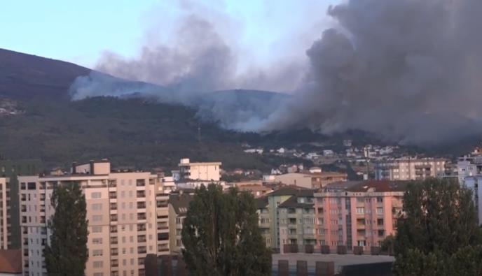 Brdo iznad Južne Mitrovice je u plamenu i gustom oblaku dima koji se izdiže iznad grada.