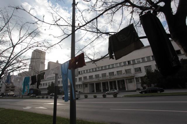 NOVI SAD - Iza akcije „Prljav veš“ gde su preko puta Banovine, u blizini zgrade Aleksandar bulevar centar na Bulevaru oslobođenja, hotela Centar kod Srpskog narodnog pozorišta i kod Spensa – prekoputa sedišta Demokratske stranke postavljeni kanapi sa vešom, stoji Treća Srbija.