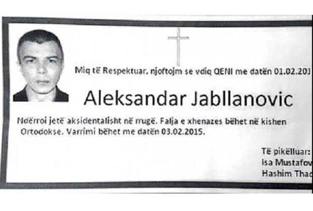 "Poštovani prijatelji obaveštavamo vas da je dana 1. februara 2015. godine preminulo pseto. Preminuo je slučajno na ulici. Oproštajna dženaza biće održana u pravoslavnoj crkvi. Sahrana će biti održana 3. 2. 2015."
