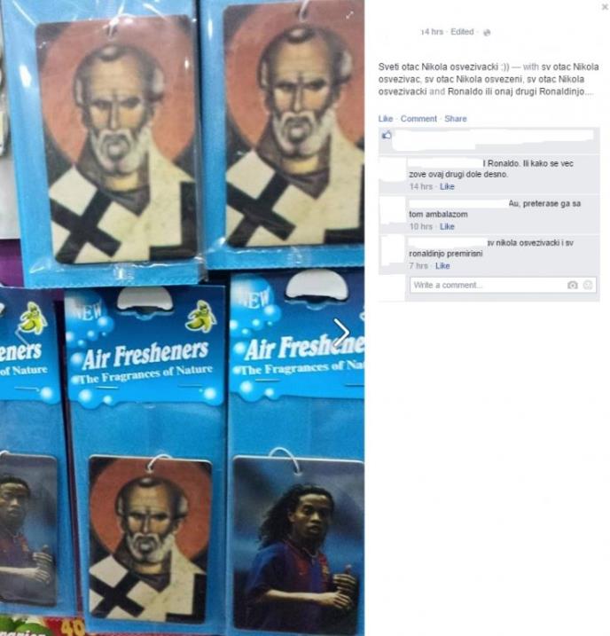 Naime fotografija koja se širi društvenim mrežama pokazuje kako se u nepoznatoj prodavnici prodaje osveživač za automobil sa likom Svetog Nikole, pored koga stoji Ronaldinjo izazvalo je razne polemike. Neki su se smejali, ali uglavnom su komentari puni kritike.