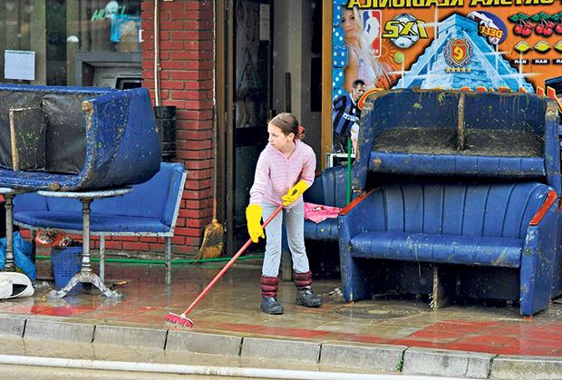 - Jedva smo uspeli da izađemo iz lokala jer smo se plašili da otvorimo vrata, a na prozorima su rešetke. Voda je ovde bila preko pola metra, nameštaj i tehnika u potpunosti su uništeni. Sad izbacujemo stvari napolje da se malo osuše i pokušavamo da očistimo mulj - priča Stojanović dok pokušava da izbaci blato i vodu iz kladionice u centru Golupca. U tome mu pomaže njegova jedanaestogodišnja ćerka Željana.