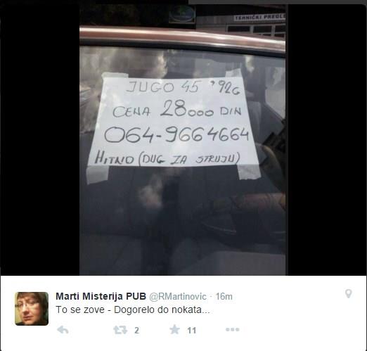 Naime, neko je na automobilu napisao da prodaje juga 45, 92. godište za 28.000, uz oznaku da je hitno jer mu je potrebno novac kako bi platio dug za struju.