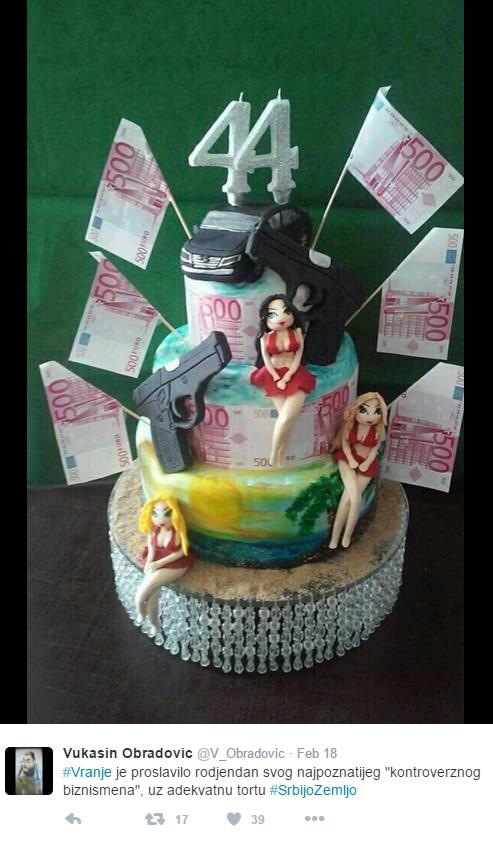 "Vranje je proslavilo rodjendan svog najpoznatijeg "kontroverznog biznismena", uz adekvatnu tortu #SrbijoZemljo", napisao je Obradović.
