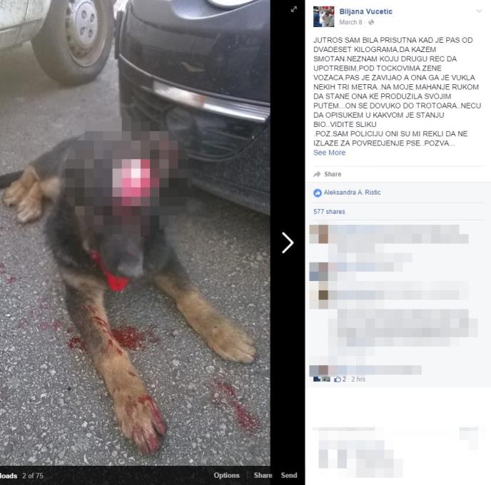 Ženi je javljeno da je pas u teškom stanju i hteli su da ga uspavaju jer ima nekoliko preloma a potreban je i značajan novac za lečenje i operacije. Ona je na svom FB profilu objavila apel gde je objasnila šta se sve desilo i rekla da će objaviti i cifru koja je potrebna da bi se spasila ova životinja.