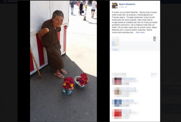 "Prima od države socijalnu pomoc u iznosu od 7.000 din. koju daje za kiriju. I tako namučena svaki dan po ovim visokim temperaturama prodaje cveće da bi imala parče hleba. Baka Radmila nema kupatilo. Ali pored sve te muke ona je uvek čista, kulturna, ljubazna i nasmejana!", dodaje Dejana.