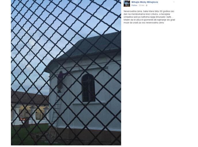 "Neverovatna žena, baka Mara blizu 90 godina ceo dan na merdevinama kreči crkvicu, a bečejska omladina sedi po kafićima ispija limunade i kafe.... Mislim da bi ulica ili spomenik bili najmanje što grad može da uradi za ovu neverovatnu ženu", piše u komentaru pored fotografije.