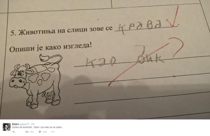 - Doneo sin kontrolni. Čitam i zamalo se ne udavi' - napisao je on uz fotografiju na kojoj se vidi kako je uz nacrtanu kravu dečak napisao pod "Životinja se na slici zove se krava".