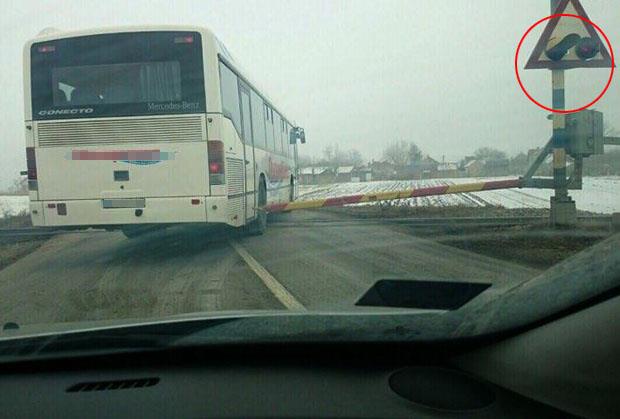Na slici se jasno vidi kako vozač autobusa rizikujući svoj i život putnika, obilazi spuštenu rampu na pružnom prelazu.