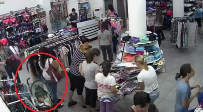 Jedna staje kao "štit" i izigrava mušteriju dok druga stoji iza njenih leđa i vadi stvari iz torbe koja je bila zakačena za dečija kolica.