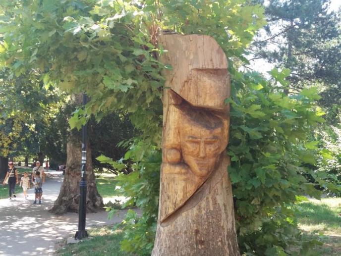 Neobična skulptura je nastala prošle godine tako što je ovaj beogradski vajar rešio da iskoristi staro stablo platana srušeno u oluji. On je ovom stoletnom stablu udahnuo život i stvorio od njega umetničko delo, a sada je ono olistalo i postalo prava turistička atrakcija.
