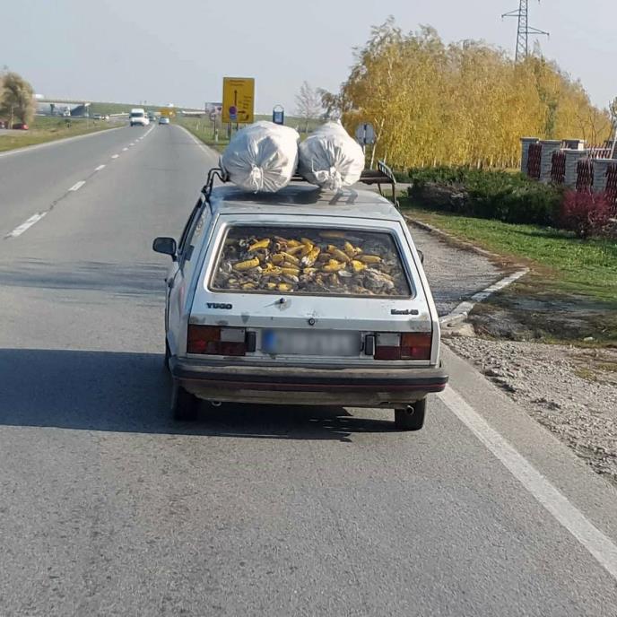 Umesto magareta, tovarnog konjčeta, freze ili traktora, jugo još jednom dokazuje da se u njemu može preterati sve i svašta. Ovog puta, na potezu do Kaća, to je kukuruz, a pre neku godinu, nešto južnije, i tele!