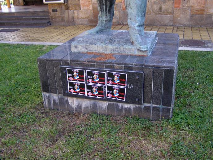 Na plakatima je ispisano Petrovgrad Nikada Zrenjanin i “akcija.org”, a prelepljena je i tabla Socijalističke partije Srbije (SPS) čije se prostorije nalaze u zgradi kraj koje je spomenik.