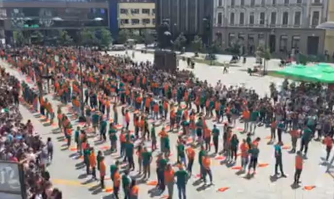 Na trgu je 1.205 maturanta, pred velikim brojem okupljenih Zrenjaninaca, izvelo koreografiju sa narandžastim kišobranima i majicama - narandžaste (devojčice) i zelenim (dečaci), sa simbolima Grada, koji je podržao organizaciju ovog događaja.