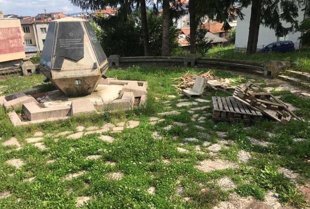 Ovoga puta na spomeniku su polomljene mermerne ploče, neke su išarane bojom, a počupane su i pobacane klupe okolo.