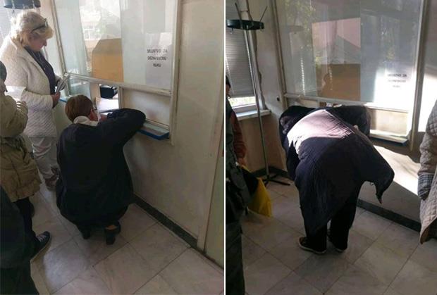 Naime, kako stoji u opisu pomenutog posta na Fejsbuku, šalter je postavljen na visinu od tek 76 centimetara, te ljudi u redu moraju bukvalno da čučnu, ako ne i kleknu, ne bi li bili u istoj ravni sa otvorom. Međutim, ni tu nije kraj preprekama, jer je i sam šalter prelepljen gomilom papira sa obaveštenjima, pa sestru s druge strane stakla jedva i vidite i čujete.