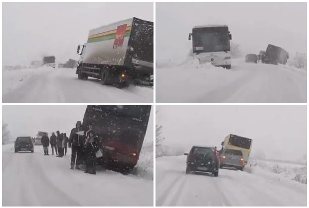 Na Tviteru se pojavio snimak na kojem se vide čak tri zaglavljena autobusa u snegu, kao i putnici koji stoje pored zavejanog autobusa i čekaju pomoć.