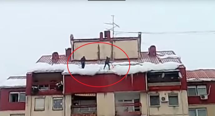 Oni su snimljeni kako lopatama čiste krov koji je pod velikim nagibom, pun snega i naizgled vrlo klizav, preneli su lokalni mediji.