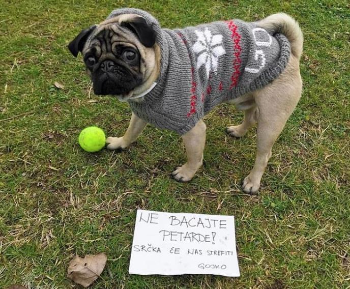 Nije prvi put da vlasnici pasa i mačaka apeluju na sugrađane da bacanje petardi svedu na minimum jer se njihovi ljubimci užasno plaše tog zvuka. Ove godine apel je "uputio" i mops Gojko izazvavši raznolike komentare na društvenoj mreži Instagram...