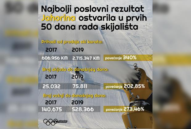 Prihodi od skijališta su povećani za 340 odsto sa 600.000 KM na 2.720.000 KM a za samo 50 dana rada premašili su cjelokupnu zimsku sezonu 2017 godine za 5 odsto što je samo još jedan od pokazatelja da menadžerski tim OC Jahorina radi dobar posao te da je Jahorina opet u samom vrhu zimskih destinacija.