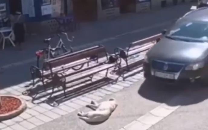 Pas je mirno ležao i sunčao se na šetalištu u pešačkoj zoni... Naišao je auto kojem mesto svakako nije bilo u pešačkoj zoni... Da li ga nije video...