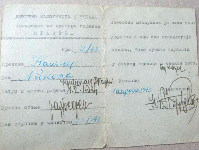 Da prvoaprilska šala iz 1943. godine bude još neverovatnija, ona nosi datum izdavanja 1. april 1943. godine, ali na ovoj iskaznici stoji da je pomenuti Kraljevčanin „stupio u članstvo“ tek 23. maja 1943. godine. U članskoj karti piše još i ovo: “Navedeni maloumnik je član ovog društva i ima sve privilegije ludaka. Može lupati gluposti u svakoj prilici i svakom dobu”. U potpisu - taj i taj, predsednik.