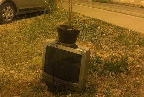 Na slici se vidi stari TV i saksija cveća na njemu, ostavljeni na travnjaku ispred kuće...