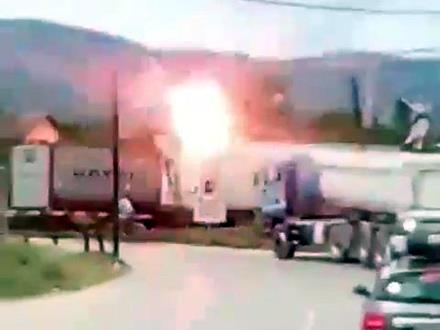 Na snimku je zabeležen trenutak eksplozije, električni luk nastao tom prilikom u koji je upao migrant, kao i njegov pad sa vagona na zemlju.