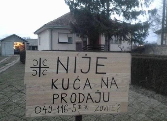 Nije kuća na prodaju..., piše na parčetu kartona pobodenom ispred ograđene porodične kuće... Na kartonu deo broja telefona i krst sa ocilima...