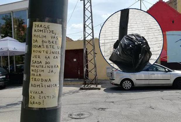 "Drage komšije, molim vas da đubre odlažete u kontejner jer ga za sada do kontejnera nosim ja, vaša trudna komšinica. Hvala za čistiji grad!", glasila je poruka ostavljena na banderi.