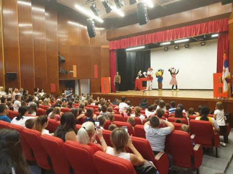 Najpre je na filmskom platnu prikazan animirani film, a onda kao da su junaci filma oživeli i pred decom na pozornici su se pojavili u istim likovima animatori iz Vranja.
