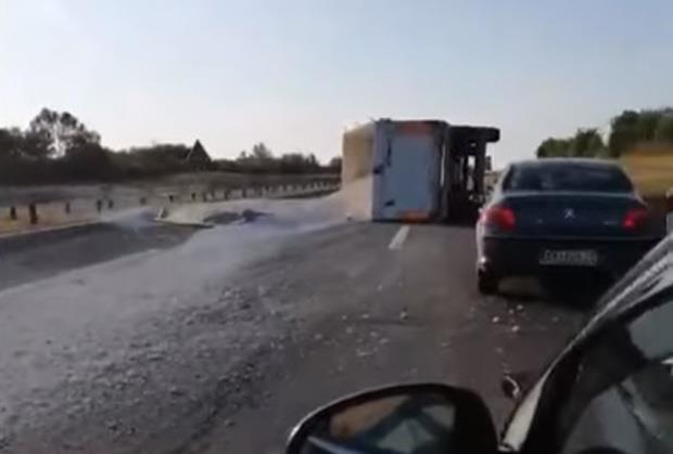 Iz kamiona koji je prevozio kamen duž celog puta se rasuo tucanik, ali i delići prozorskog stakla. Upravo iz ovog razloga saobraćaj se na ovoj deonici auto-puta odvija otežano.