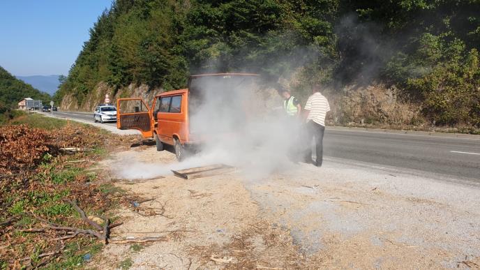 NOVA VAROŠ – Na magistralnom putu od Bistrice prema Novoj Varoši na samom ulasku u Novu Varoš zapalilo se kombi vozilo.