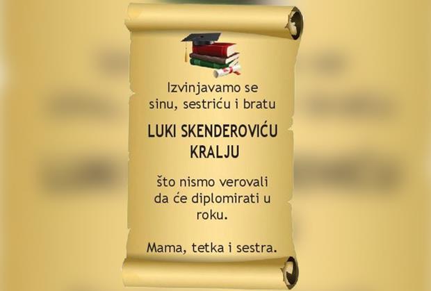Nesvakidašnje izvinjenje, odštampano kao na pergamentu, osvanulo je u poslednjem broju "Subotičkih novina". Novopečenom ekonomisti ženski deo porodice se javno izvinio, jer nisu verovale da će studije završiti u roku.