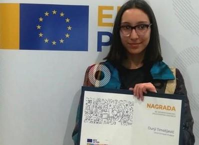 Dunja Timotijević, učenica kraljevačke Gimnazije, jedna je od pobednica likovnog konkursa „Moja evropska zajednica“ koji je raspisala Evropska unija, a nagradu je ovoj Kraljevčanki uručio Sem Fabrici, šef Delegacije EU u Srbiji.