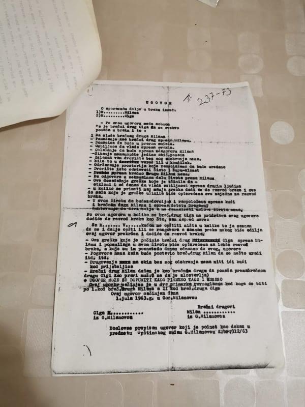Sudija je nekako uspeo da ih pomiri, ali je u spisima Opštinskog suda u Gornjem Milanovcu , kao dokaz, ostao ugovor sačinjen 1. jula 1963. godine, kojim je Sredoje odredio nova pravila bračne igre.