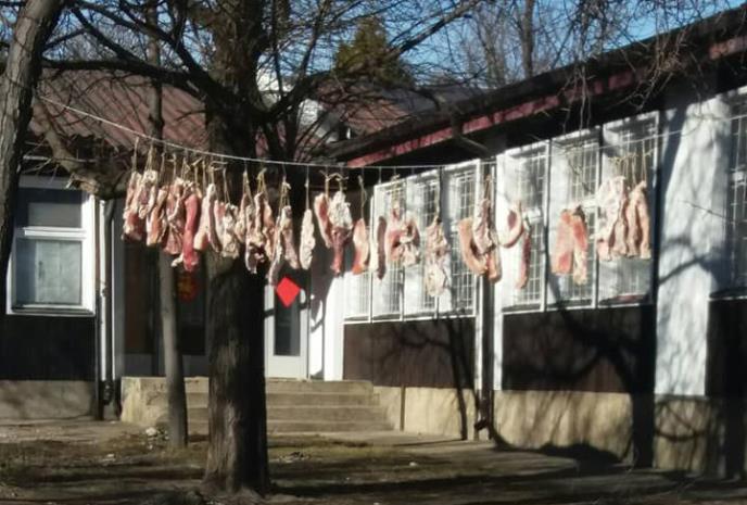 U krugu paviljona gde žive radnici iz Kine, meštani Bora juče su uslikali neobičan prizor: na žicama za veš bilo je pokačeno – meso!
