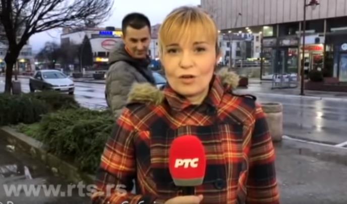 Reporterka je naometano nastavila da priča o saobraćaju, dok je prolaznik skakako i mahao rukama.