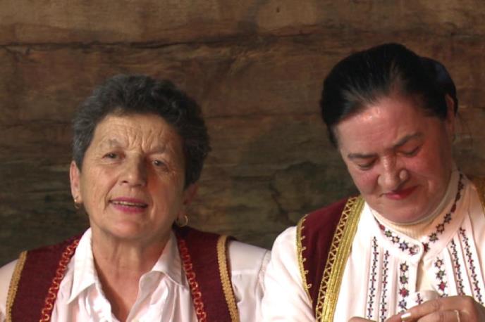 Upravo preko vibera, Rakila sa svojim drugaricama iz izvorne grupe „Dragačevke“ vežba narodne pesme.