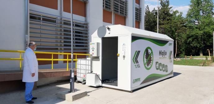 - U tunelu se oni izlažu dezinfekcionom sredstvu na bazi alkohola, koje se raspršuje u vidu aerosola, i potom čisti izlaze iz tog prostora. Tek tada oni mogu da bez bojazni skinu svoju zaštitnu opremu. Na taj način se sprečava kako kontaminacija samih zdravstvenh radnika, tako i okoline. Kapacitet tunela je veliki: on može da dezinfikuje 600 osoba za sat vremena – rekao je Ovuka.