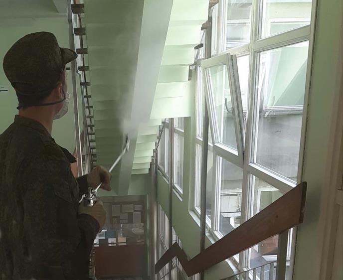 Ruski vojnici su korišćenjem specijalizovanih prskalica koje alkoholni rastvor raspršuju do mikro čestica, dezinfikovali unutrašnjost objekata, nameštaj i opremu, kao i krug ovih ustanova.