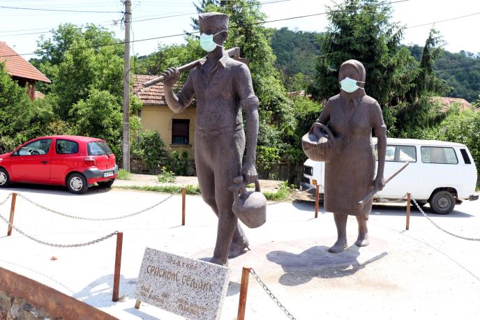 JAGODINA - Stanovnici Glavinaca, sela podno Juhora, oko sedam kilometara od Jagodine, podigli su u centru sela spomenik srpskom seljaku i seljanki, jedinstven u Srbiji, a ovih dana, s obzirom da još preti zaraza korona virusom, stavili im na lice medicinske hirurške maske.