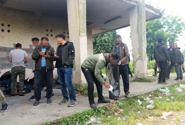 Na železničkoj stanici je stotinak migranata, uglavnom mlađih muškaraca. Neki nose zaštitne maske, ali većina ne haje za koronu. Spavaju na betonu, sede na šinama ili goloj zemlji, jedu ili leškare. Dobili su od ljudi iz Centra za tražioce azila metle i vreće za smeće pa sakupljaju otpatke i bacaju ih u kontejner.