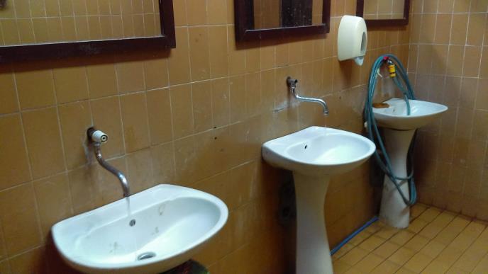 Od tri lavaboa, jedan služi za prskanje prostorije, drugi nema slavinu, a ljudi peru ruke nad slomljenim lavaboom, odakle voda pada na pod tako da nema potrebe ni da se prska.