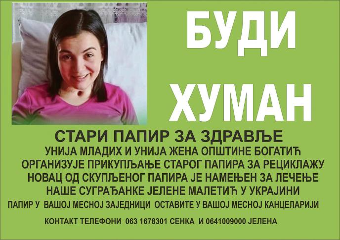 Humanitarnu akciju „Papir za zdravlje“ organizovali su mladi u Bogatiću kako bi pomogli mladoj sugrađanki Jeleni Maletić i sakupili novčana sredstva za njeno lečenje matičnim ćelijama u Kijevu.